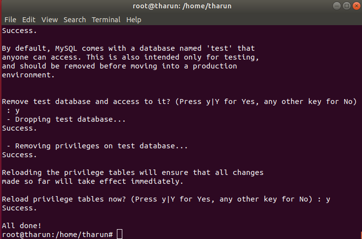 4. Remove test database and access to it? (Press Y for Yes, any other key for No: Y