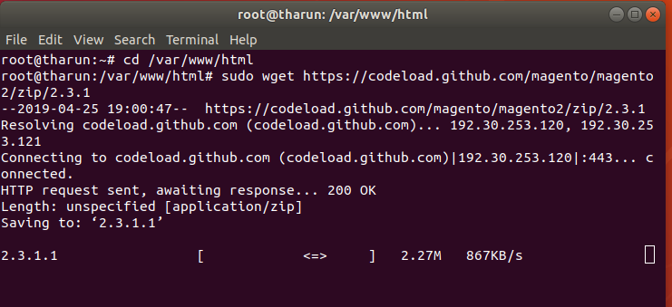 sudo apt-get install wget cd /var/www/html sudo wget https://codeload.github.com/magento/magento2/zip/2.3.1 sudo unzip 2.3.1 mv magento2-2.3.1/ magento231 sudo chmod -R 777 magento231