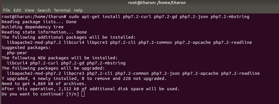 sudo apt-get install php7.2-curl php7.2-gd php7.2-json php7.2-mbstring