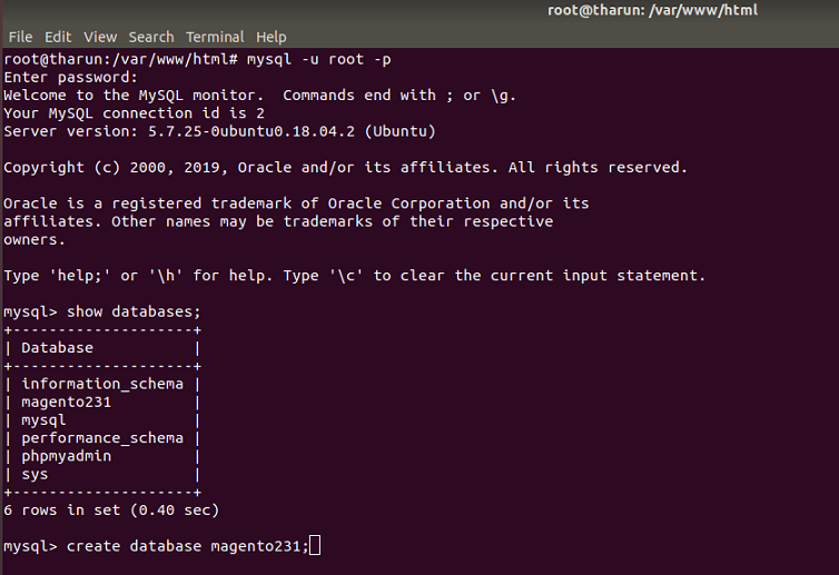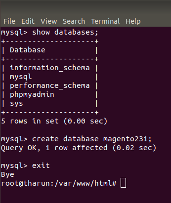 mysql -u root -p mysql> show databases; mysql> create database magento231; mysql> quit